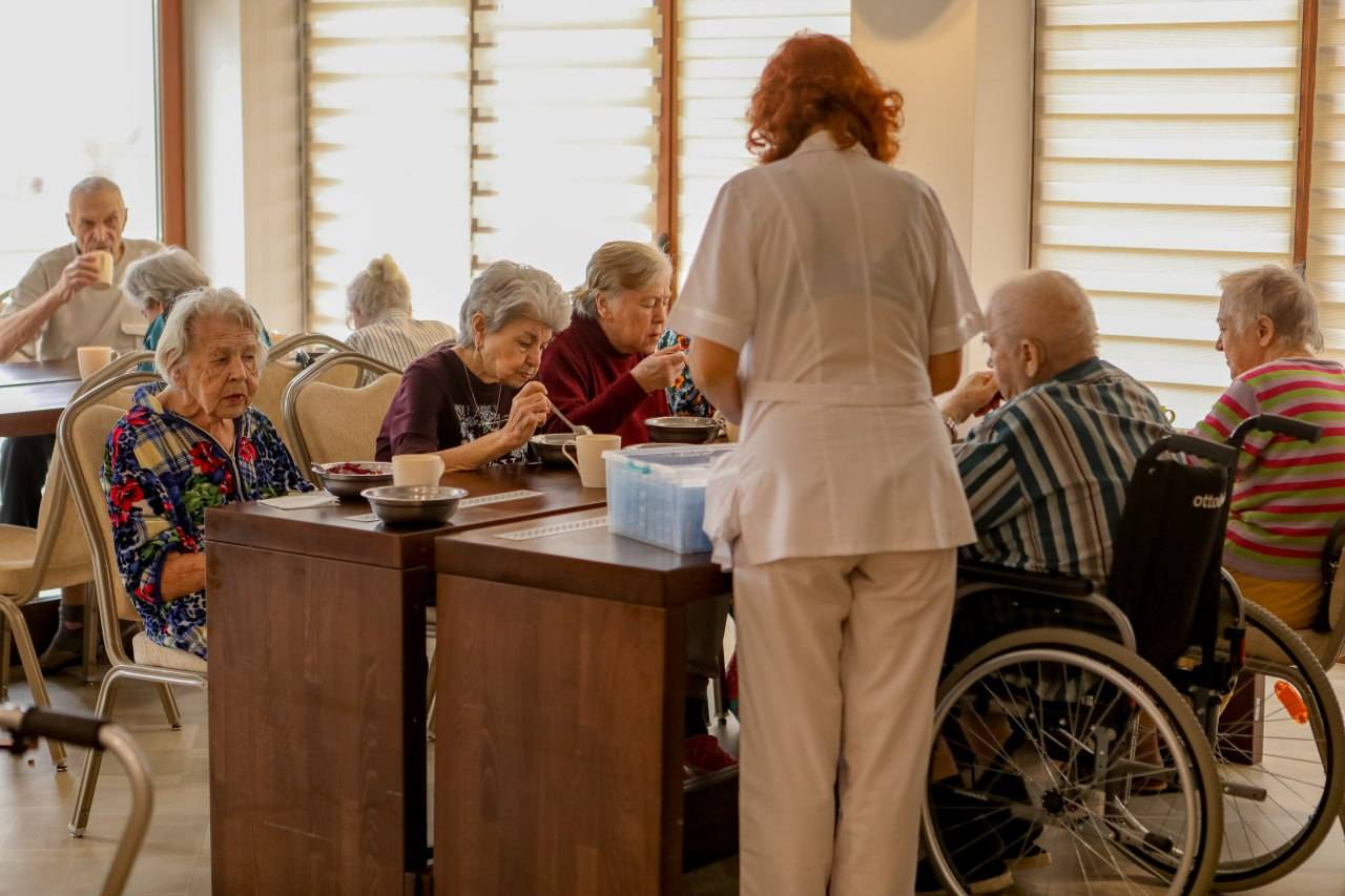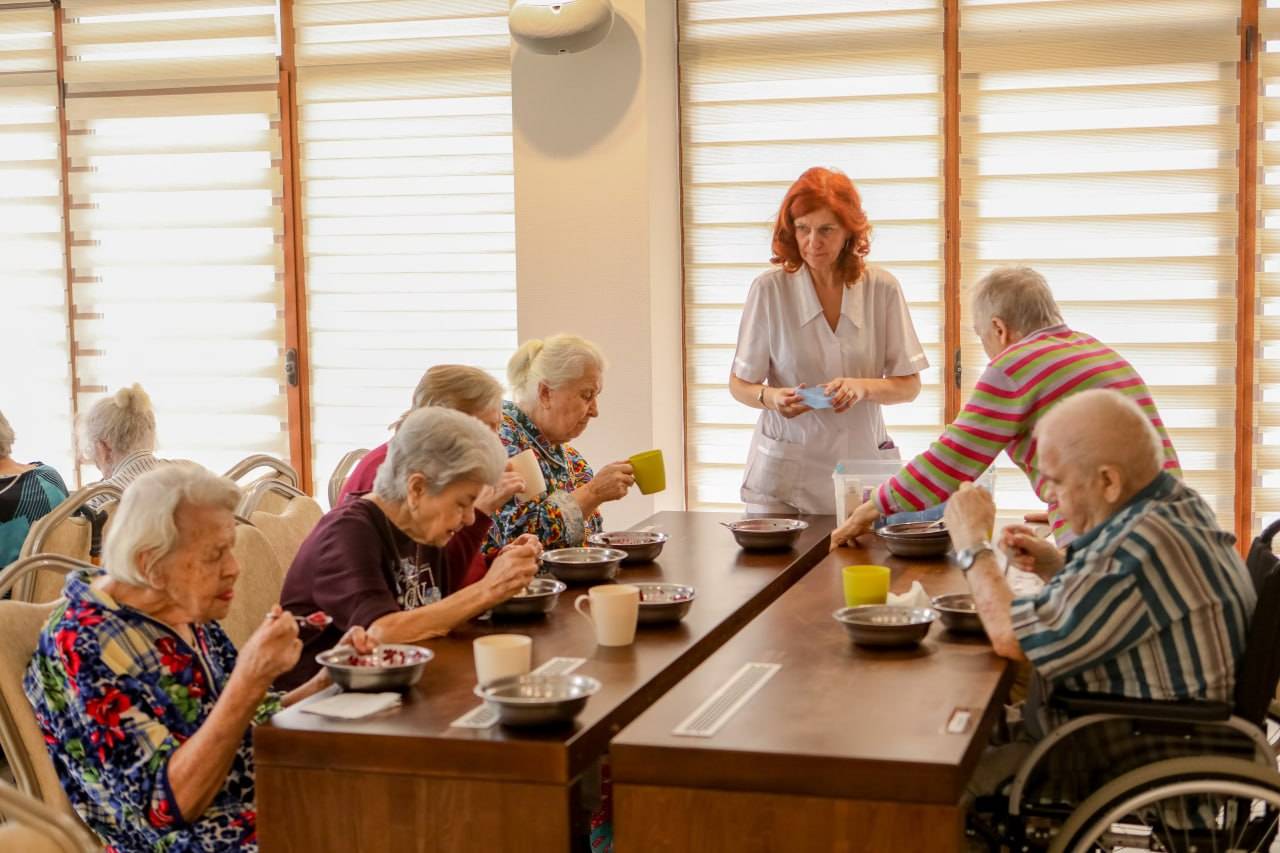 Питание четырёхразовое, сбалансированное и адаптированное под потребности пожилых людей. Меню составляет диетолог с учётом возрастных особенностей. Для постояльцев с диабетом, гипертонией и другими заболеваниями предусмотрено диетическое питание. По желанию можно заказать индивидуальное меню за дополнительную плату.